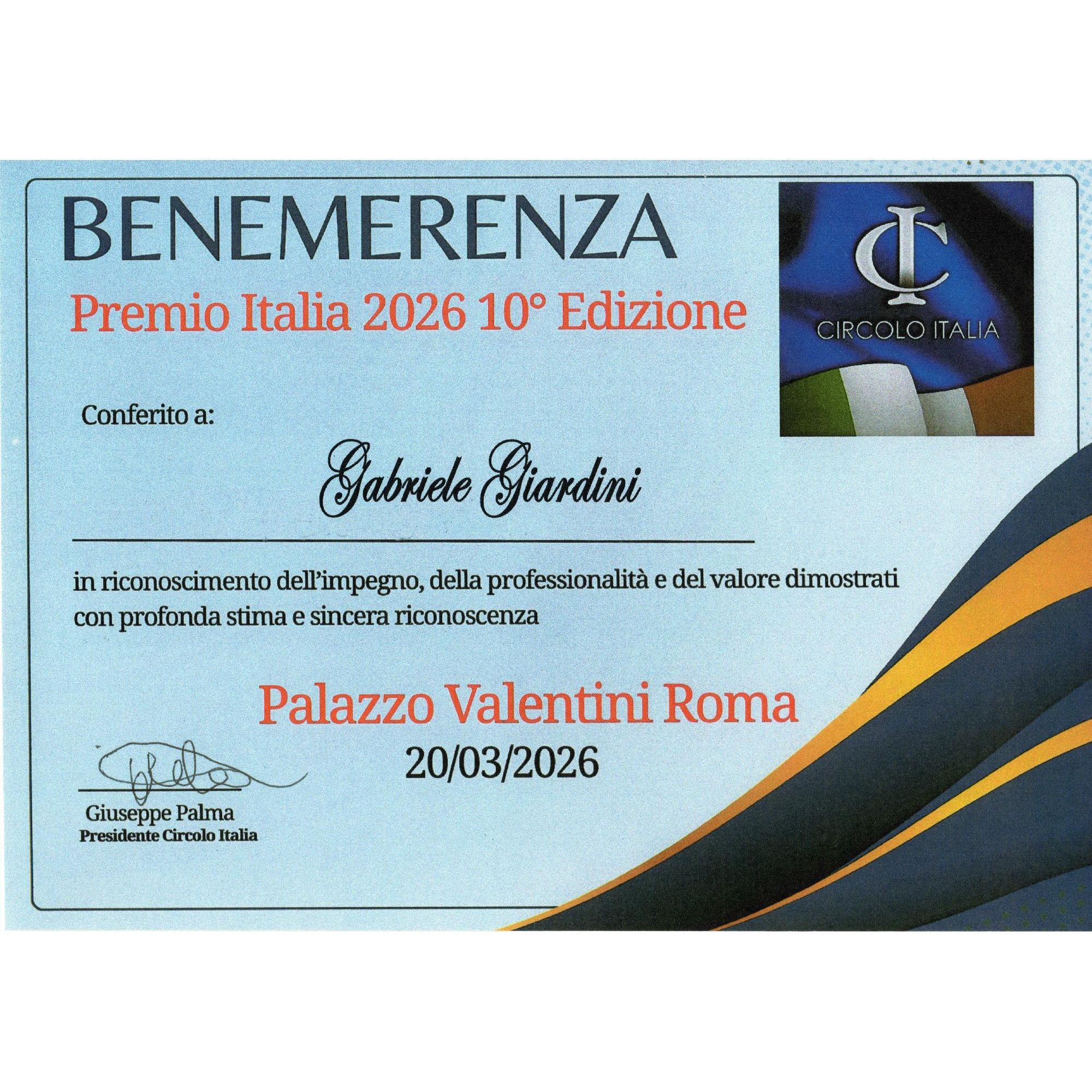 Conferito a Gabriele Giardini il PREMIO ITALIA decima EDIZIONE per l'ARTISTA ROMANO che dimostra sempre la sua professionalità. PREMIATA LA SUA ATTIVITA'